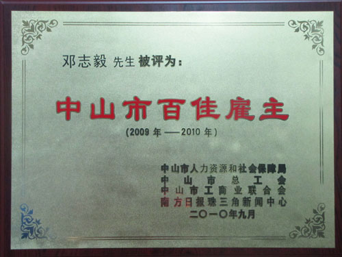 2010年9月13日下午2:00,中山市2010年度百佳雇主頒獎典禮暨“同是中山建設者”百佳流動務工人員評選活動啟動儀式在市文化藝術中心大劇場舉行。伴隨著現場近千名觀眾的熱烈掌聲,由中山市人力資源和社會保障局、中山市總工會、中山市工商聯以及南方日報珠三角新聞中心共同舉辦的“中山市首屆百佳雇主”評選結果正式揭曉,我司在眾多申報企業中脫穎而出,獲“中山市首屆百佳雇主”殊榮。