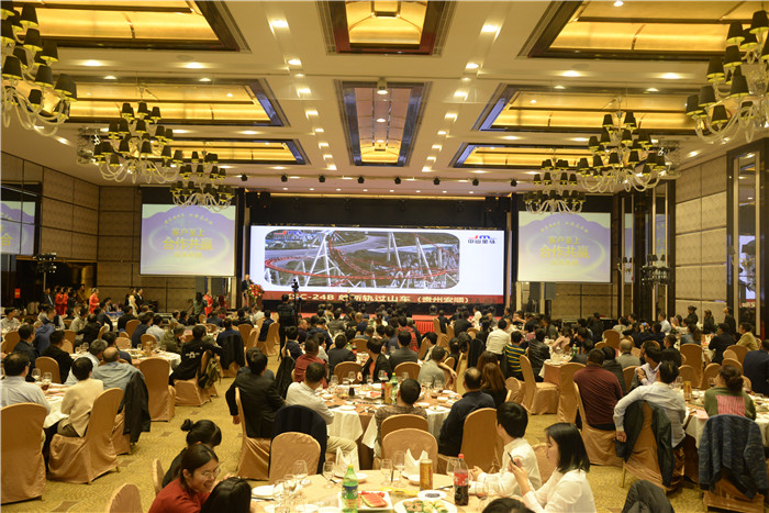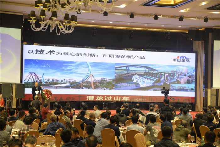 當日,晚宴現場燈光璀璨,鮮花吐蕊;臺上歌舞升平,奏樂交織;臺下同仁相邀,觥籌談歡,其樂融融。整個宴會廳洋溢著一片和諧、溫馨、歡樂的氛圍。晚宴開場,公司總經理劉總上臺致辭,對座下眾賓客的到來致以熱烈的歡迎,對長期以來關心和支持金馬發展的合作伙伴表示了誠摯的感謝,并向來賓們介紹了公司的經營理念、企業文化、服務承諾和產品優勢等。致辭中,劉總就公司最新研發和交付的產品作了詳細的介紹和視頻演示,斷軌過山車、垂直過山車、寬翼過山車、國內最大飛行塔、國內最高礦山車、室內影視過山車等多項新技術、新產品不斷涌現在舞臺大屏中,真實錄制的設備運作視頻和逼真的研發產品模擬情景,如磁石般吸引著諸多聚焦的目光,更贏得了眾賓客的頻頻驚喜驚艷驚嘆的贊許聲。