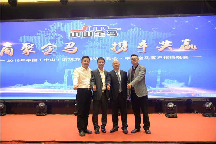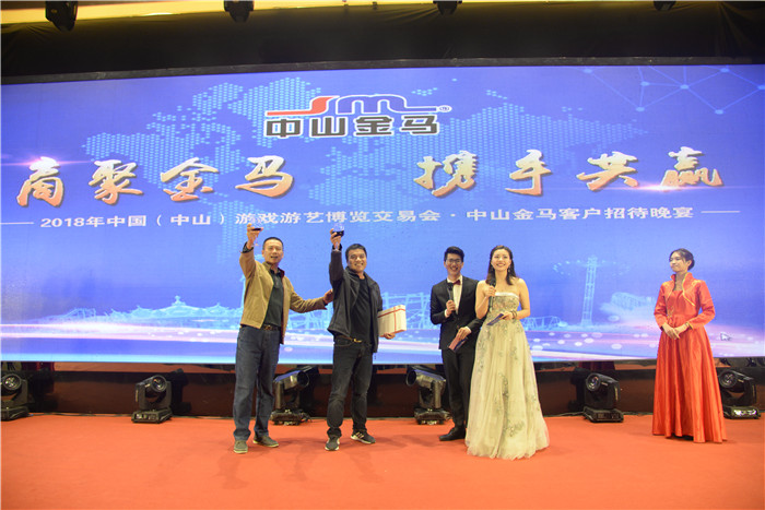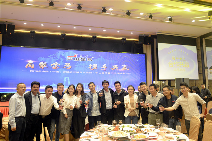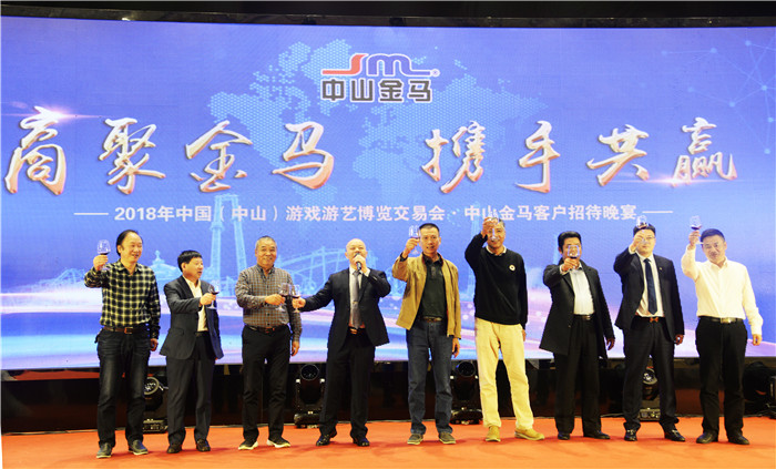 11月28日,時值第十一屆中國(中山)國際游戲游藝博覽交易會行業盛會召開之際,中山金馬公司在喜來登酒店隆重設宴,精心籌劃了一場“商聚金馬,攜手共贏”的主題晚宴,為遠道而來的新老客商朋友、合作伙伴接風洗塵,與行業同仁歡聚一堂,共襄盛會!