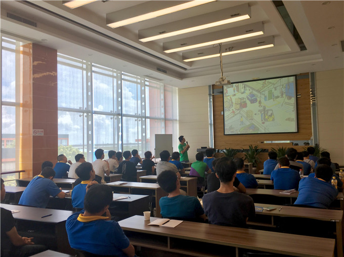 其次,精益部代表以公司員工的優秀精益提案為例,生動地解釋精益生產的必要性,提倡“全員參與,共創精益”,逐步深化新員工的精益意識。接著安全委員會代表通過分享真實的案例,結合公司生產的現實環境,學習各類安全事故的實際應急救援方法,提高新員工的安全防范意識。