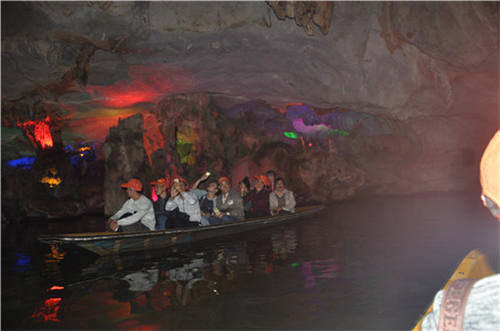 鏡頭一:賞過風景如畫的鼎湖山,我們來到了盛名遠傳的七星巖。七座形態各異的山峰,八個壯觀非凡的巖洞,移步換景之間,我們都不由得驚嘆于這里的每一處神秘。小艇輕游在龍巖洞的腹中暗河上,裹身于石壁鐫刻與溶洞奇景,頗有世外桃源之境。