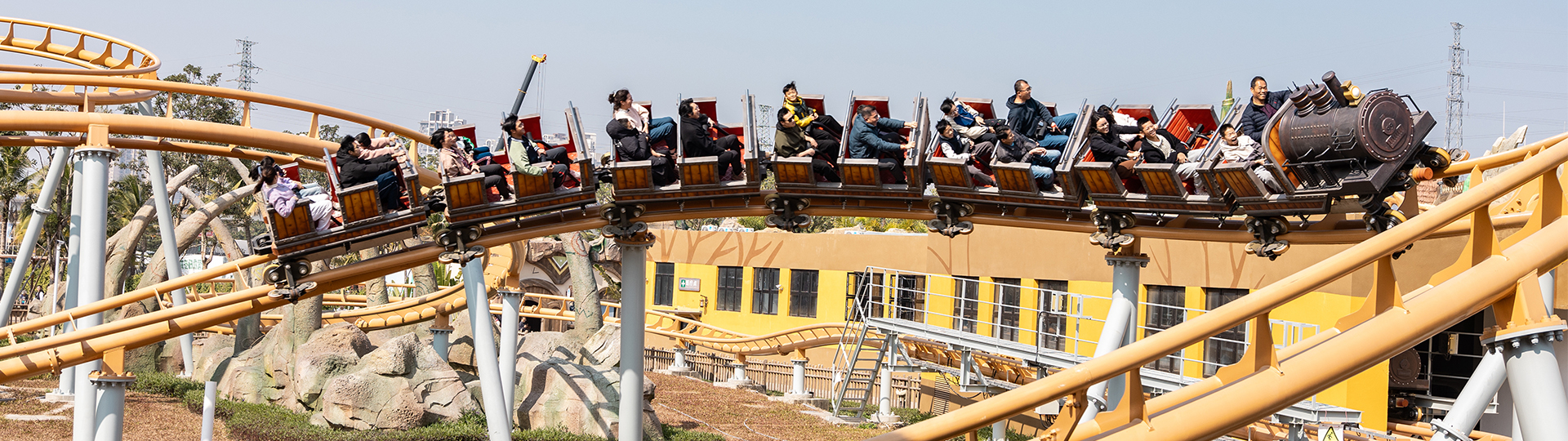 礦山車模仿古代礦山列車運行模式,采用仿古式的火車造型,游客仿佛置身于礦山現(xiàn)場。全程路軌設(shè)有兩個提升段,配合先進(jìn)變軌技術(shù)、減震膠與柔和的永磁制動,為乘客乘坐帶來舒適靜謐的體驗。同時獨特的壓腹式壓杠結(jié)構(gòu),確保包括?度1.1m以上兒童可被有效束縛,增大游客受眾范圍。