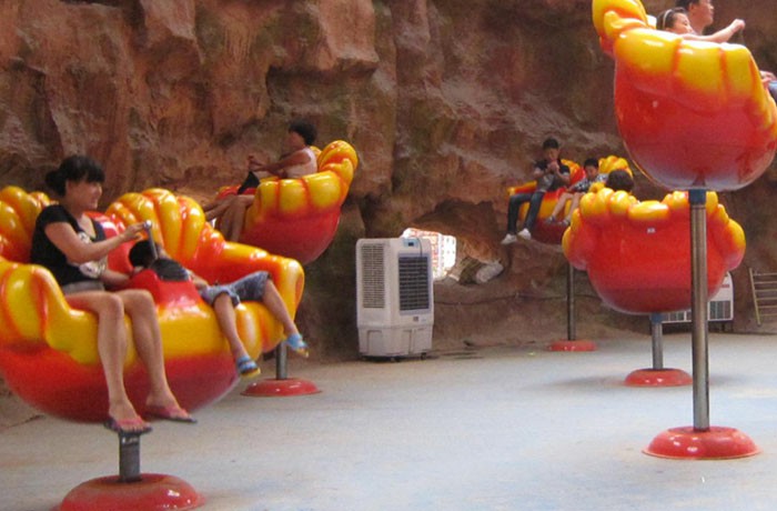 同時作升降、旋轉運動。整套設備由座艙、平臺、氣動系統、電氣控制系統等所組成。蝴蝶造型的玻璃鋼座艙,栩栩如生。設備伴隨著明快的音樂有節奏地上升和下降,座艙可以乘坐二人,座艙的旋轉由乘客自由操作。同一時間場地里的座艙此起彼伏,猶如一片蝴蝶歡快地上下跳躍、舞動,使人有如置身于大舞臺,盡情地翩翩起舞。