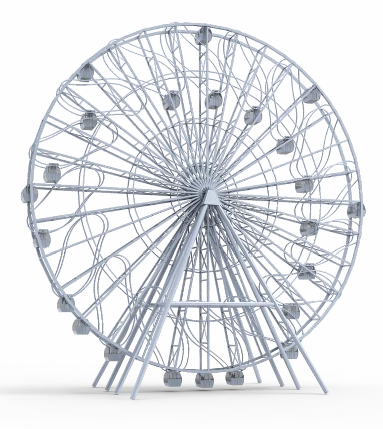 46米搖擺觀覽主體采用經(jīng)典的桁架式結(jié)構(gòu),轉(zhuǎn)盤設(shè)計有8個固定座艙及16個搖擺座艙,兩種不同的座艙形式分別給乘客以傳統(tǒng)游覽車及滑行車的不同體驗。吊廂運作時配以明麗變幻的燈飾,搭配別具匠心的內(nèi)飾配景,以及柔美動聽的背景音樂,乘客在吊箱內(nèi)多?度地縱覽周邊美景。