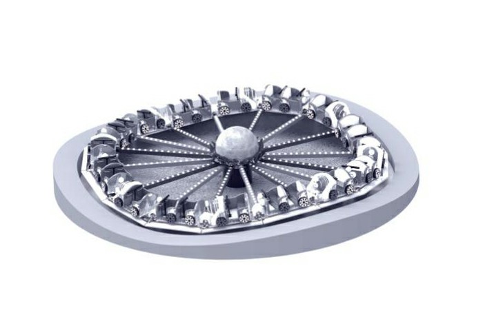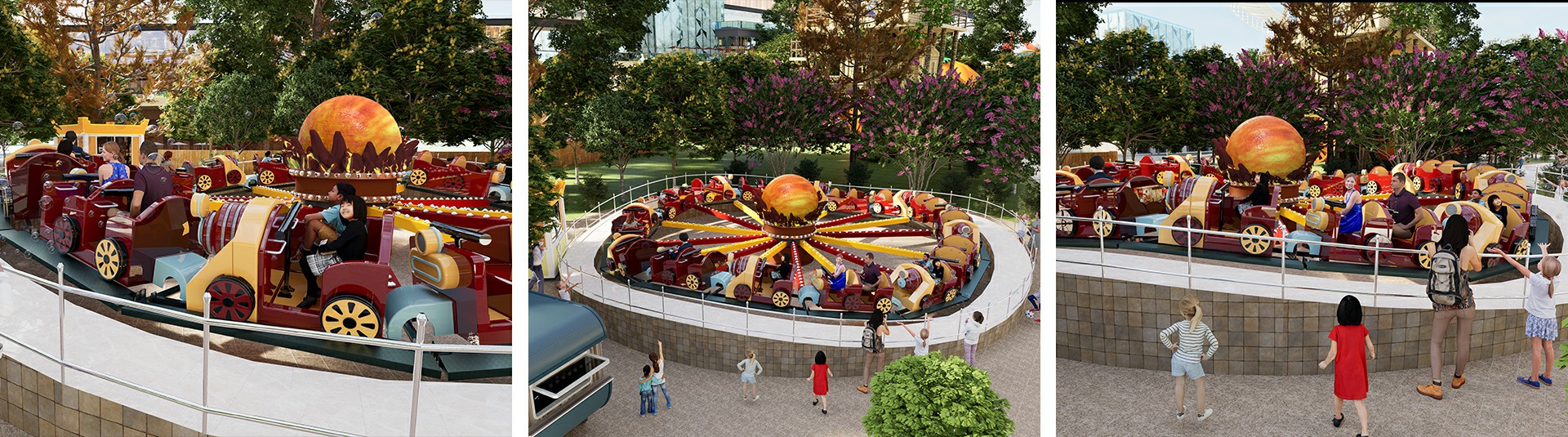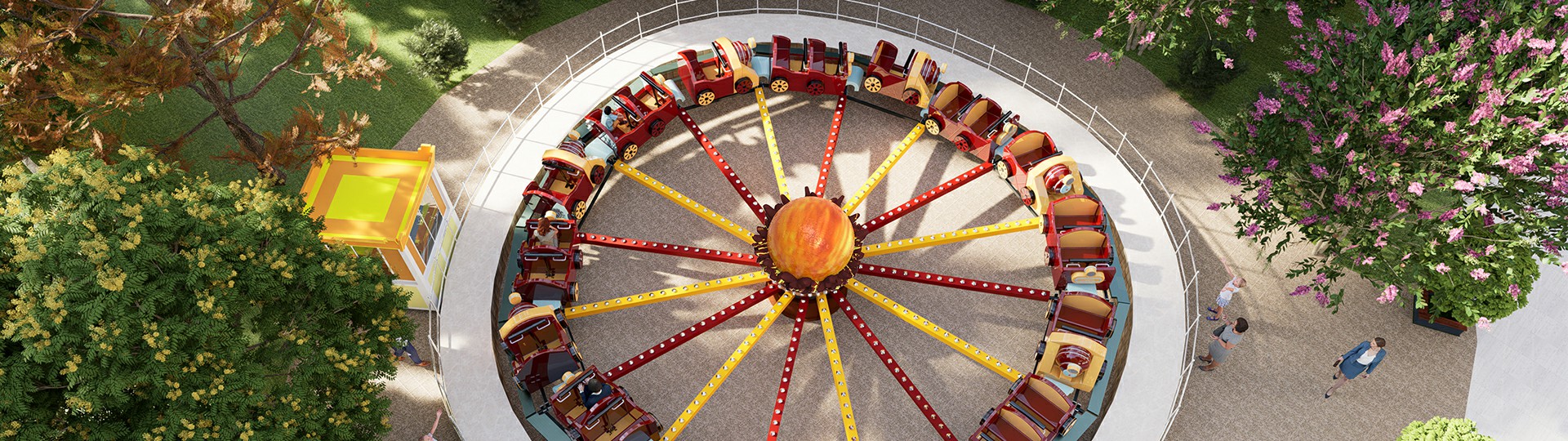 YKC-48B型烈焰戰車,以戰車追逐恒星為主題,中間支撐座裝有回轉支承連接16條轉臂。每條轉臂自帶行走輪,其中四條轉臂帶有驅動裝置,而16個座艙分別安裝在轉臂之間。轉臂行走輪下方布置有環形的起伏路軌,在轉臂驅動 裝置的驅動下,烈焰車體圍繞中心的恒星高低起伏轉動,座艙隨轉臂旋轉運動 的同時,并沿路軌上下運動,使乘客體驗多重復合旋轉運動帶來的樂趣。