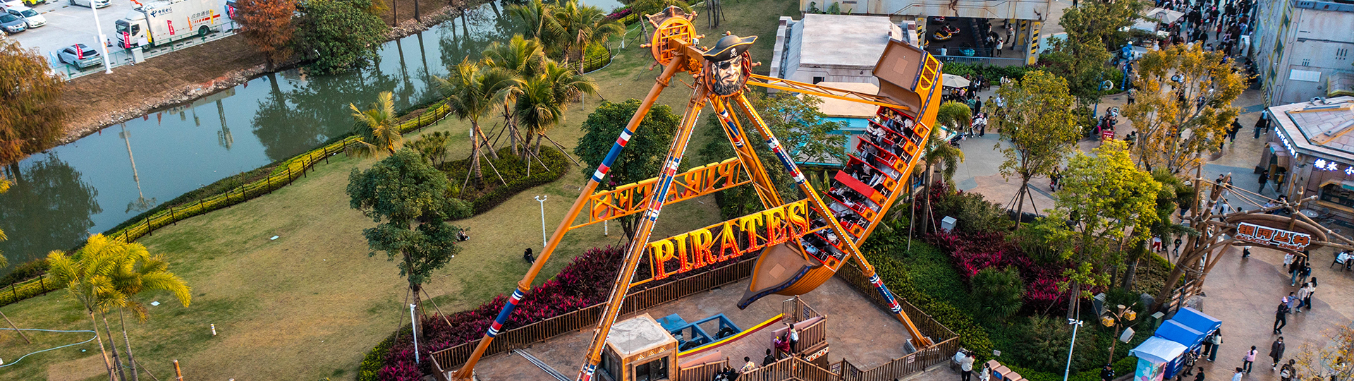 海盜船繞?平軸來回擺動,模擬海盜乘?出海的場景,交替??的失重和超重感讓乘客盡情體驗搖擺的樂趣。