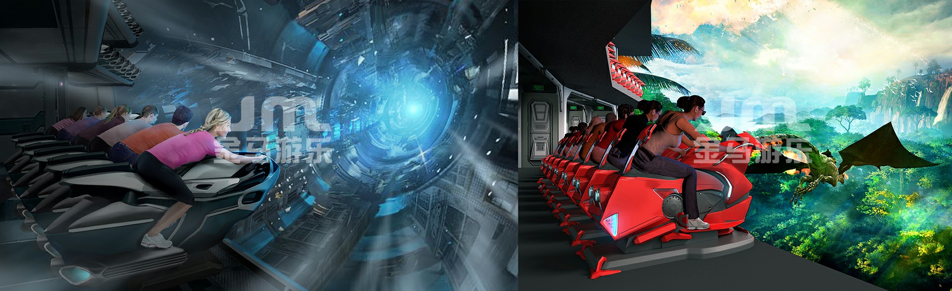 騎跨式飛行影院以騎跨方式代替傳統座椅,屬國內首創,采用獨立多自由度座椅,使每一位乘客擁有著相同的感觀,結合提升體驗效果;結合高清球幕電影以及震撼逼真的科技特效,為乘客打造一場身臨其境的沉浸式游樂體驗。