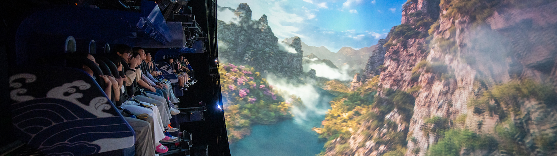 平推式飛行影院采用獨特的六自由度懸掛式動感座椅,逼真模擬墜落、爬升、轉彎等動作,與巨型大球幕影片內容配合,產生身臨其境的全景式包圍的真實飛行,給游客帶來一場翱翔于空中的強烈沉浸式體驗。